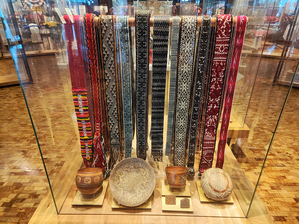 На первой фотке — коллекция традиционных мексиканских текстильных поясов-фахас, сотканных на поясном станке с сложными геометрическими узорами в черно-белых, серых и красных тонах, а также разноцветными акцентами, висящих вертикально на горизонтальной перекладине. Ниже расположены керамические изделия: два расписных глиняных горшка, плоская тарелка с орнаментом, плетеная сферическая корзина и небольшие деревянные предметы.