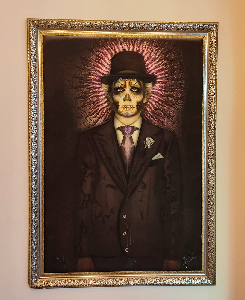 Современная художественная интерпретация культовой мексиканской фигуры Эль Катрин, или «Нарядного скелета». Первоначальная концепция была разработана художником Хосе Гваделупе Посадой и позднее популяризирована муралистом Диего Риверой как символ мексиканской идентичности и идеи о том, что смерть — великий уравнитель.