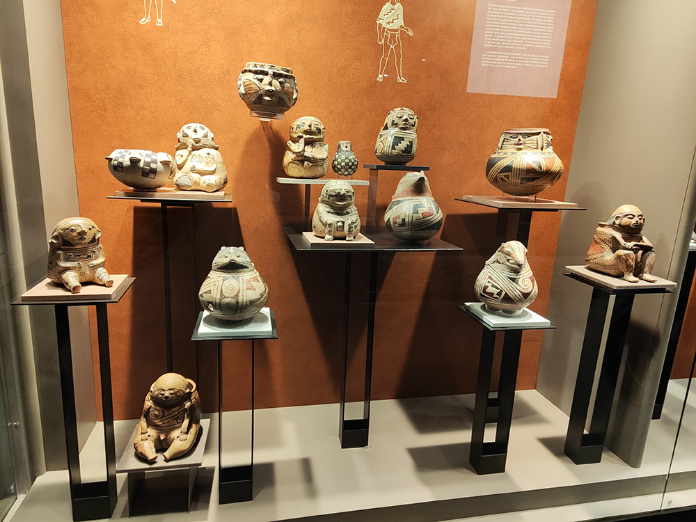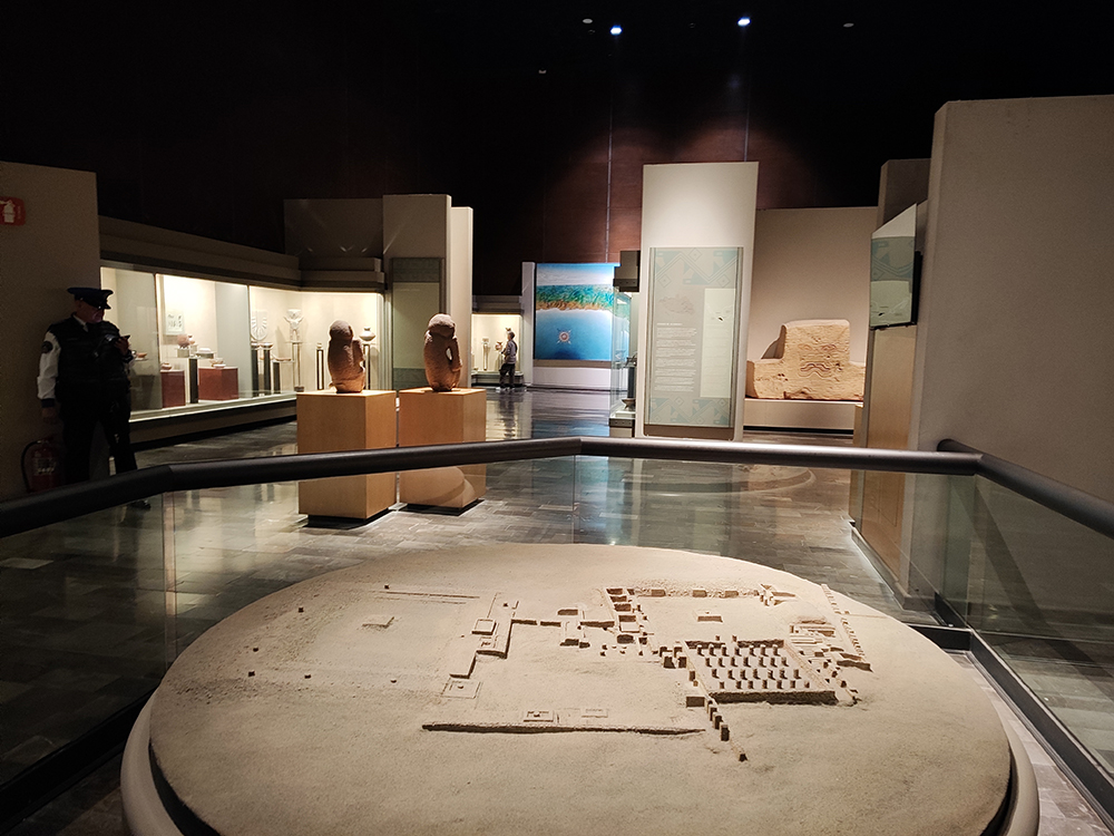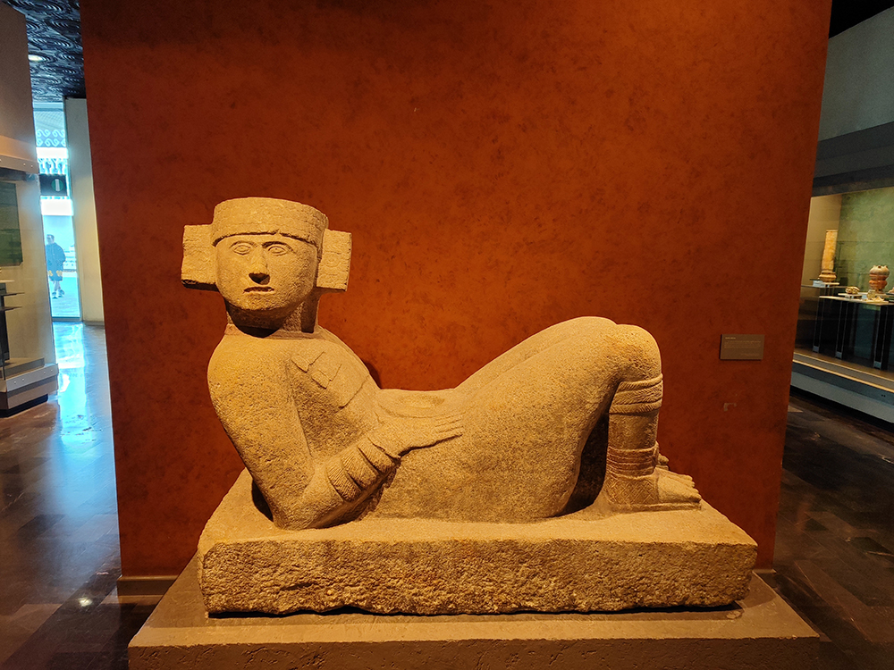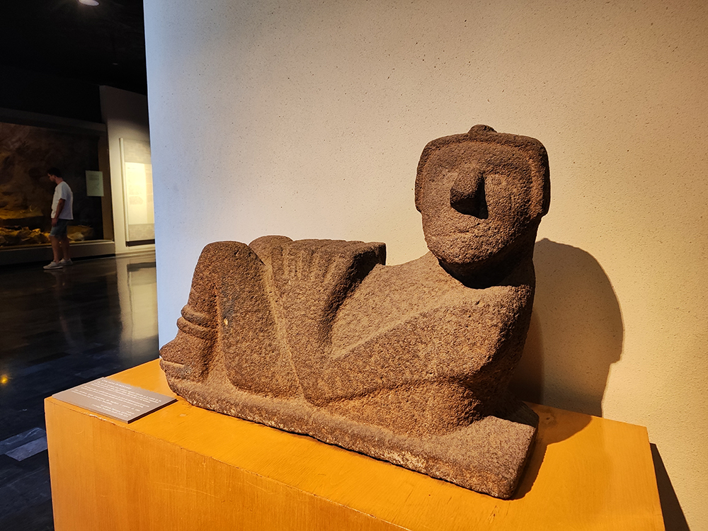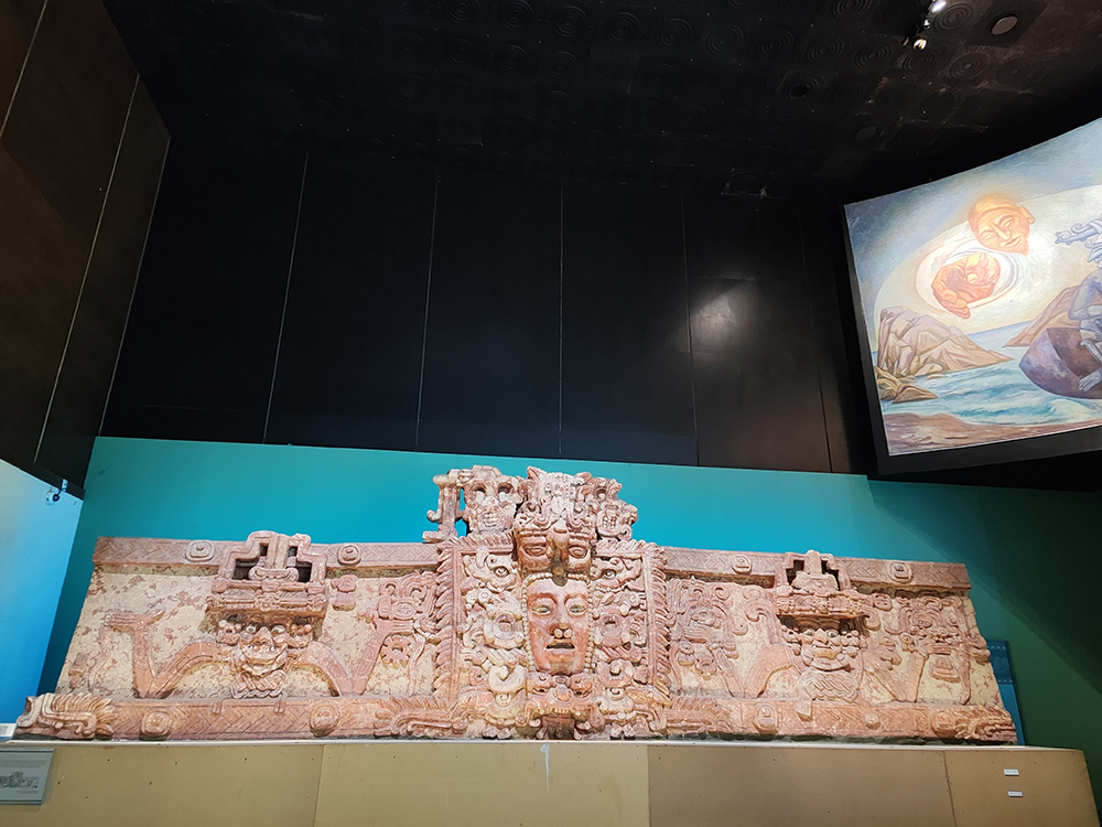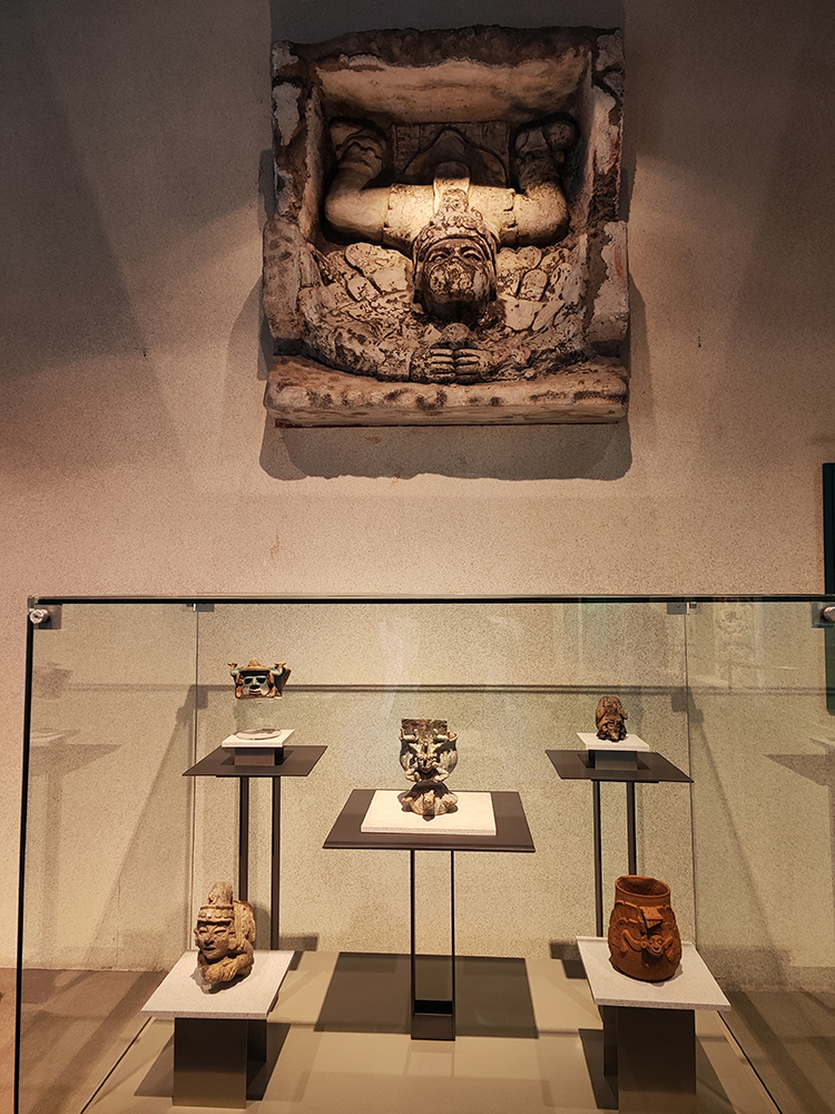 Экспозиция с подлинными древними каменными и керамическими изделиями доколумбовых культур. На стене — рельеф с лежащей фигурой Чак-Мооля, держащего чашу на животе (классический образец искусства тольтеков). Под ним в витрине на отдельных постаментах размещены небольшие скульптуры и сосуды: керамические головы и маски с выразительными чертами лиц, ритуальный сосуд в виде фантастического существа и другие артефакты, характерные для мезоамериканских цивилизаций. Всё выполнено в типичном мексиканском археологическом стиле с акцентом на символику и детализацию черт лица.