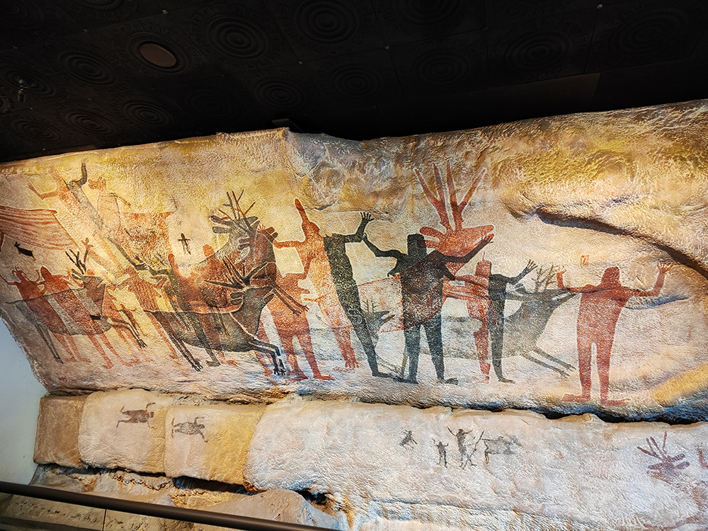 Яркая настенная роспись, изображающая сцену охоты и человеческие фигуры в стиле доколумбового пещерного искусства, представляет собой впечатляющий образец мексиканского наследия.