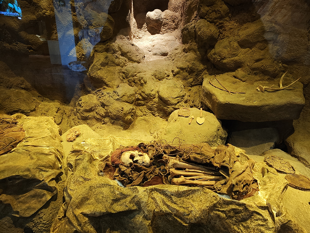Макет древнего захоронения, мексиканского скелета, окруженного тканью и артефактами в экспозиции.