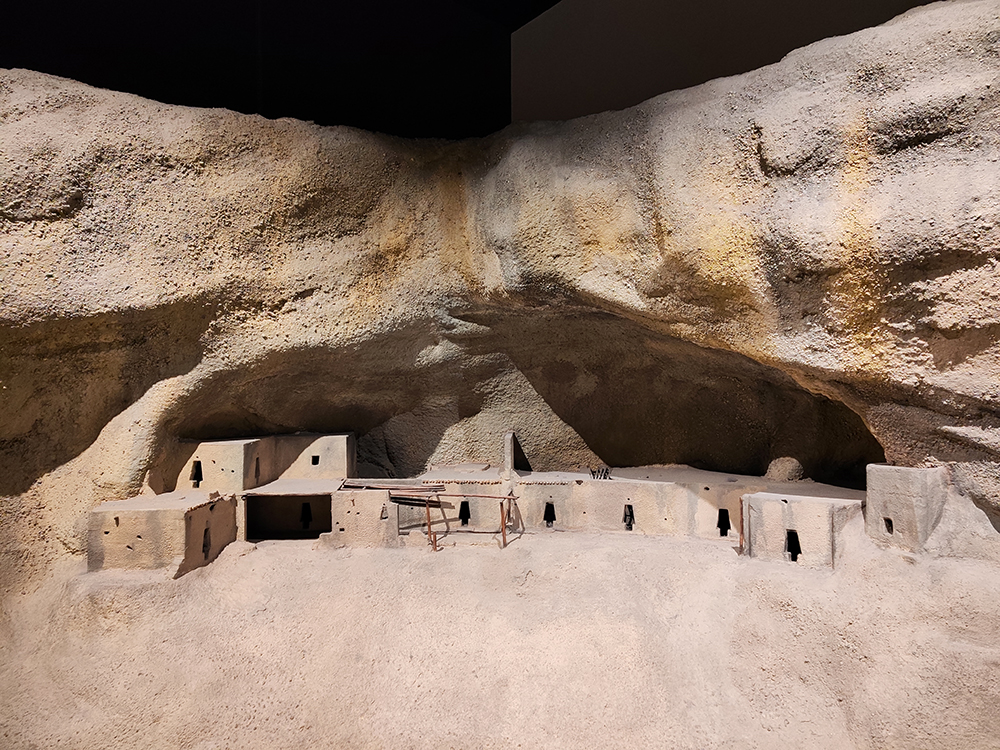 Макет мексиканского поселения, демонстрирует древние жилища, построенные из глины или камня, расположенные у подножия большого скального навеса.
