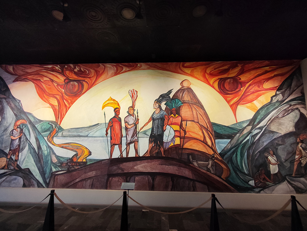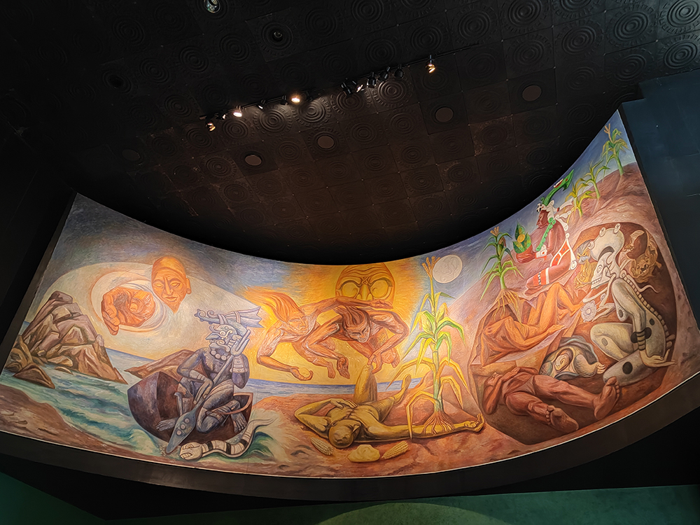 Гигантская изогнутая фреска в полукруглом зале, созданная в ярком мексиканском стиле с преобладанием охристых, жёлтых и терракотовых тонов. На ней изображены сцены из доколумбовой мифологии и повседневной жизни древних народов: огромные стилизованные лица божеств, воины в пернатых головных уборах и с копьями, фигуры, возделывающие маис, ритуальные сцены, лежащие и сидящие люди, змеи, растения кукурузы и символы солнца и луны. Композиция читается слева направо как повествование о происхождении мира, жизни и смерти. Фреска занимает всю стену и потолок перехода, создавая эффект полного погружения.
