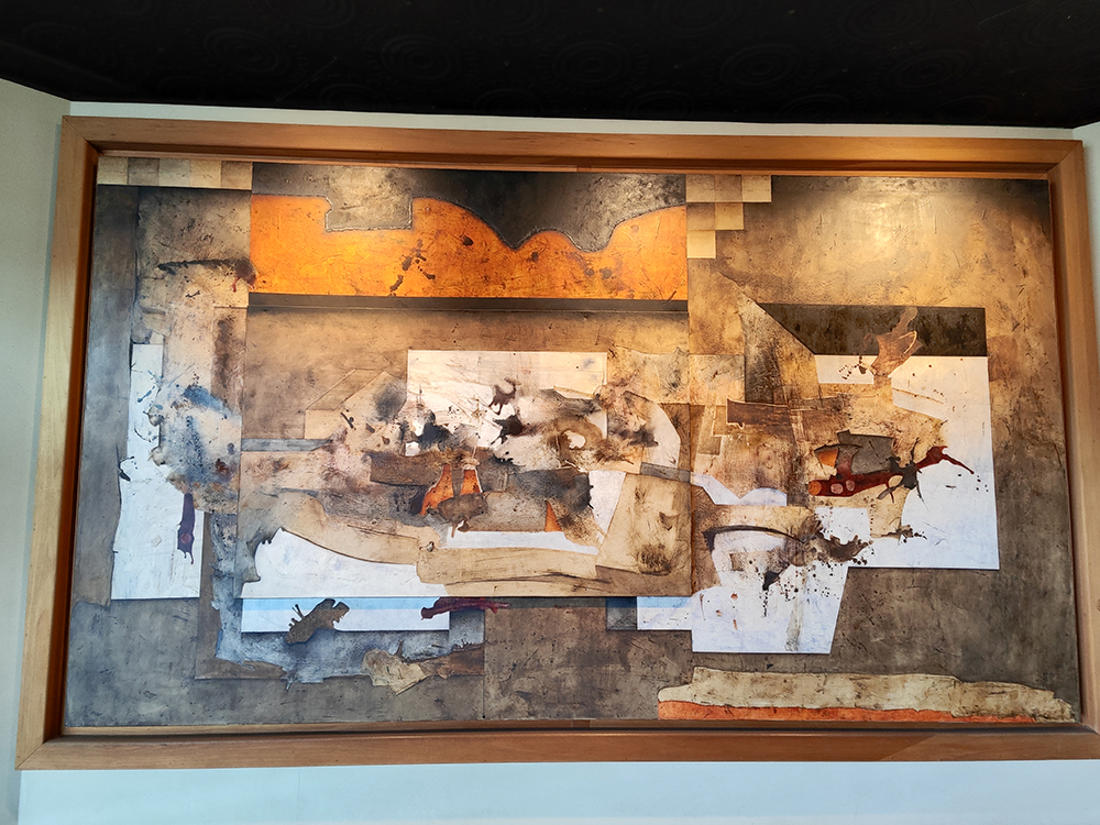 Абстрактное, многослойное полотно с использованием землистых, золотистых и белых тонов, выполненное мексиканским художником.