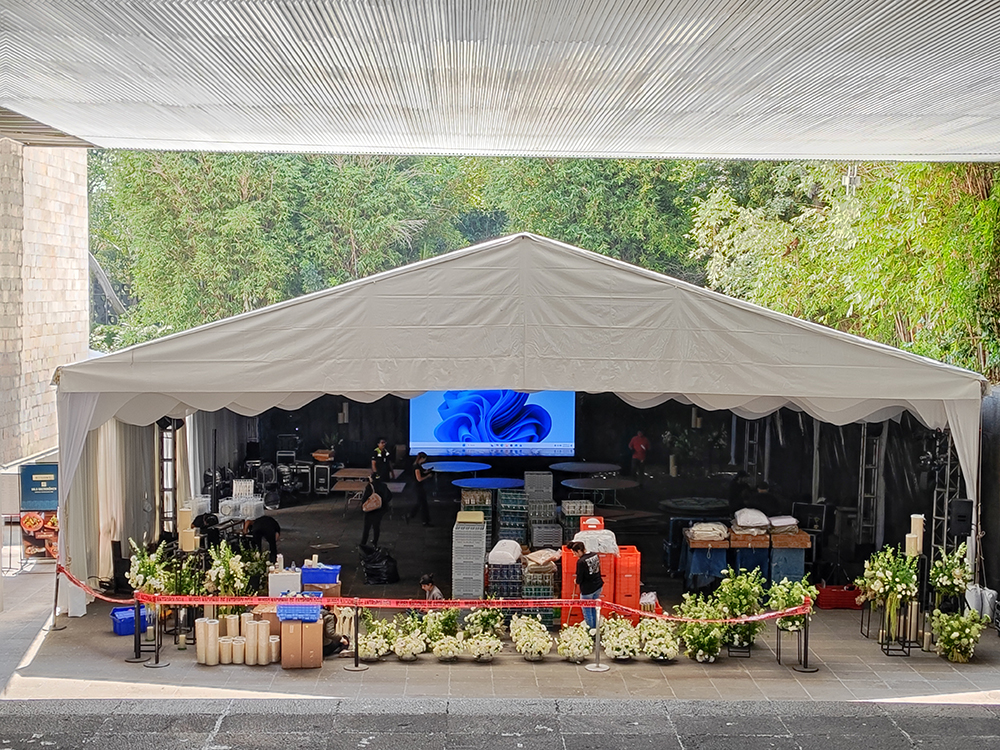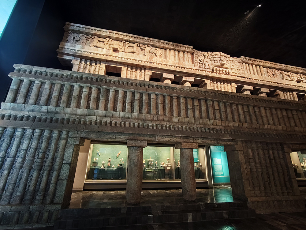 Фасад храма ацтекского бога Тлалока — монументальная каменная реконструкция с характерными для ацтекской архитектуры зубчатыми фризами, рельефами и массивными колоннами в виде цилиндров с геометрическим орнаментом. В нижней части — вход в зал, оформленный как портал древнего сооружения, за которым видны витрины с мексиканскими древностями. Всё это — часть постоянной экспозиции, посвящённой культуре Центральной Мексики доколумбовой эпохи.