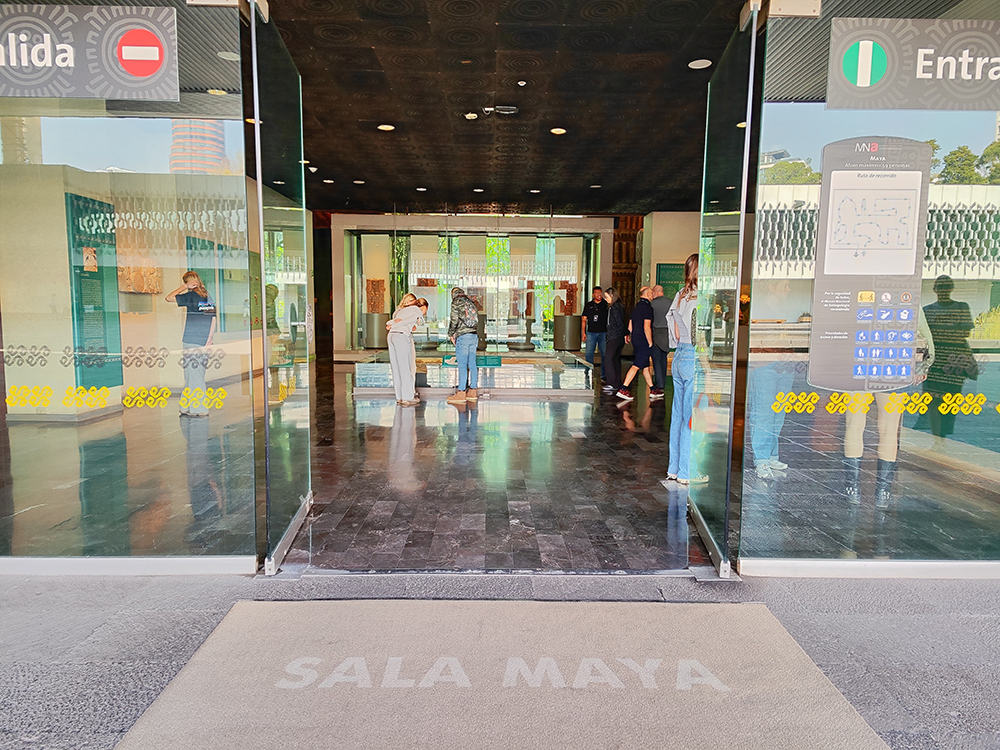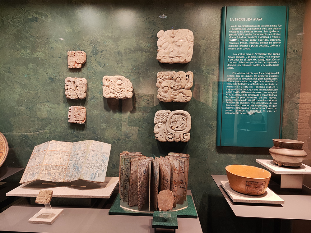 Выставка, посвящённая мексиканской письменности и глиптике майя. На зелёной стене закреплены несколько глиняных рельефов и печатей с иероглифическими надписями и изображениями. Ниже — подлинные фрагменты майяских кодексов (книг-ширма на бумаге из коры), а также керамические сосуды с росписью и резьбой. В центре внимания — образцы одного из самых сложных и совершенных видов письма доколумбовой Америки: сочетание логограмм, силлабограмм и идеограмм, использовавшихся для записи текстов на камне, керамике, штуке и в складных книгах.