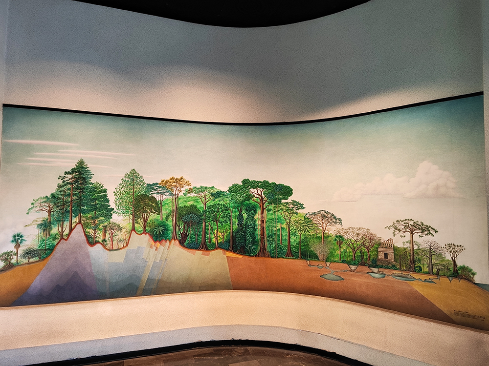 Панорамная диорама, показывающая постепенное превращение густого тропического леса в безжизненную пустыню с остатками древней мексиканской пирамиды на горизонте.