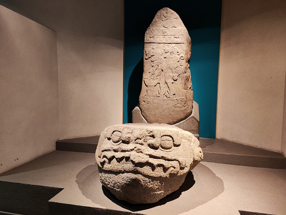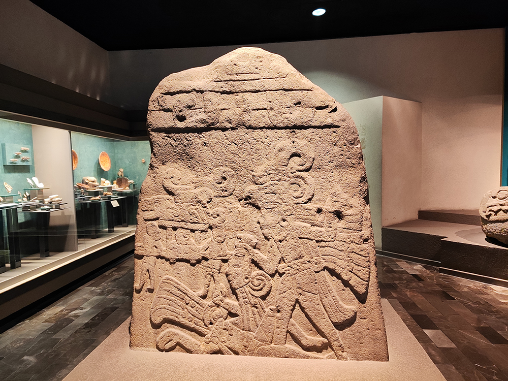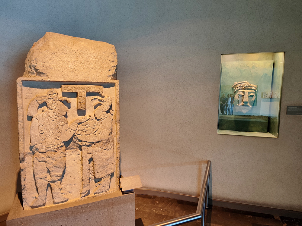 Каменная стела с рельефным изображением двух воинов в полном боевом облачении: один стоит слева в профиль, с копьём и щитом, второй — справа, лицом к зрителю, держит в руках отрубленную голову за волосы. Над ними — крупный иероглифический картуш. Справа от стелы в витрине выставлена знаменитая гигантская базальтовая голова ольмекской цивилизации с характерным шлемом и суровым выражением лица. Всё это — подлинные мексиканские древности доколумбовой эпохи.