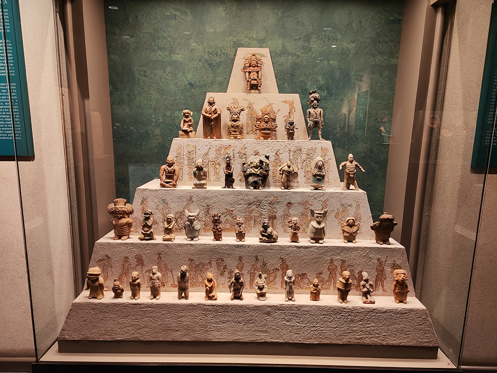 Пирамидальная витрина с коллекцией древних мексиканских глиняных фигурок, расставленных по иерархическому принципу: на вершине одна крупная фигура правителя или божества в сложном головном уборе, ниже ряды воинов, жрецов, музыкантов и знати, а в самом низу — многочисленные изображения простых людей, ремесленников и слуг. Все скульптурки выполнены в характерном стиле доколумбовой Центральной Мексики, преимущественно из обожжённой глины, с детальной проработкой костюмов, украшений и атрибутов. Экспозиция стилизована под социальную пирамиду древнего общества.