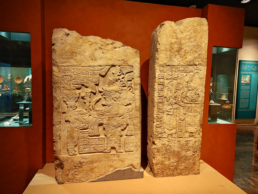 Две высокие известняковые стелы майяского типа, установленные рядом в зале с оранжевыми стенами.