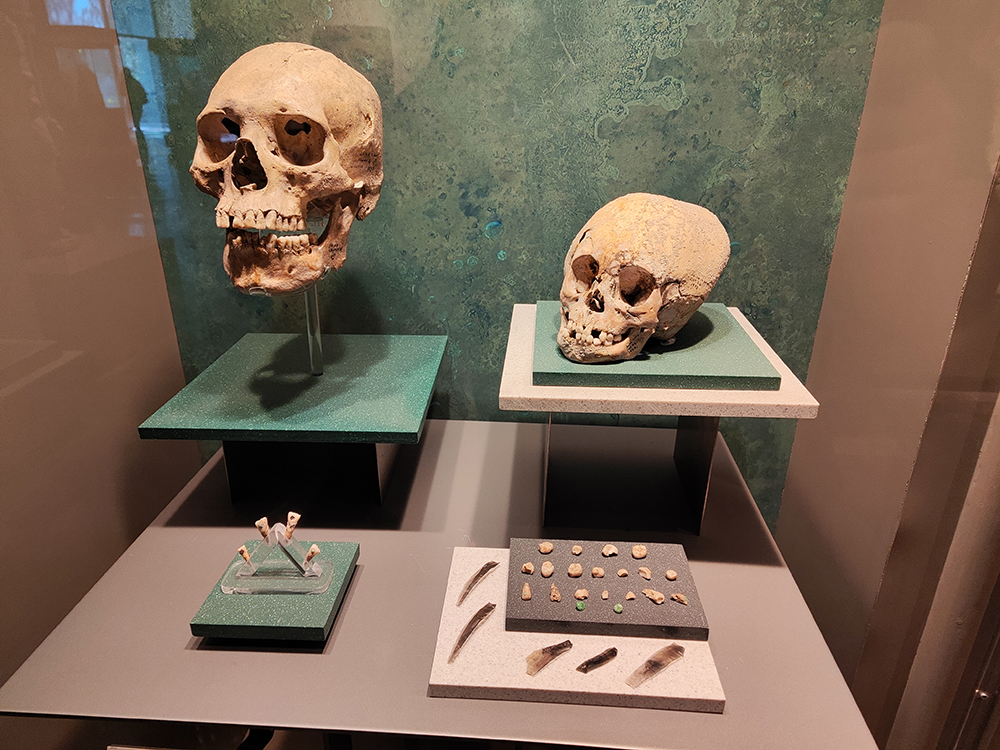 Ниже на подиумах представлены погребальные дары из той же могилы: нефритовые и костяные бусы, подвески, раковины и обсидиановые изделия.