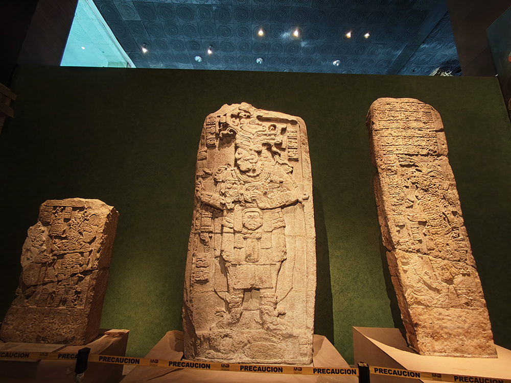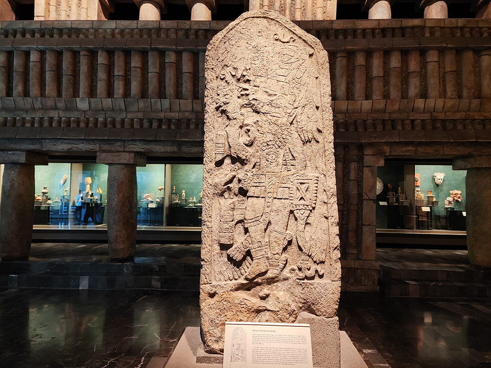Большая каменная стела с рельефным изображением воина-победителя в богатом головном уборе из перьев кетсаля, с копьеметалкой и щитом. Фигура попирает ногой поверженного пленника. Рельеф выполнен в классическом майяском стиле конца VIII века. Стела стоит в зале доколумбовых культур, на фоне реконструкции архитектурных элементов.