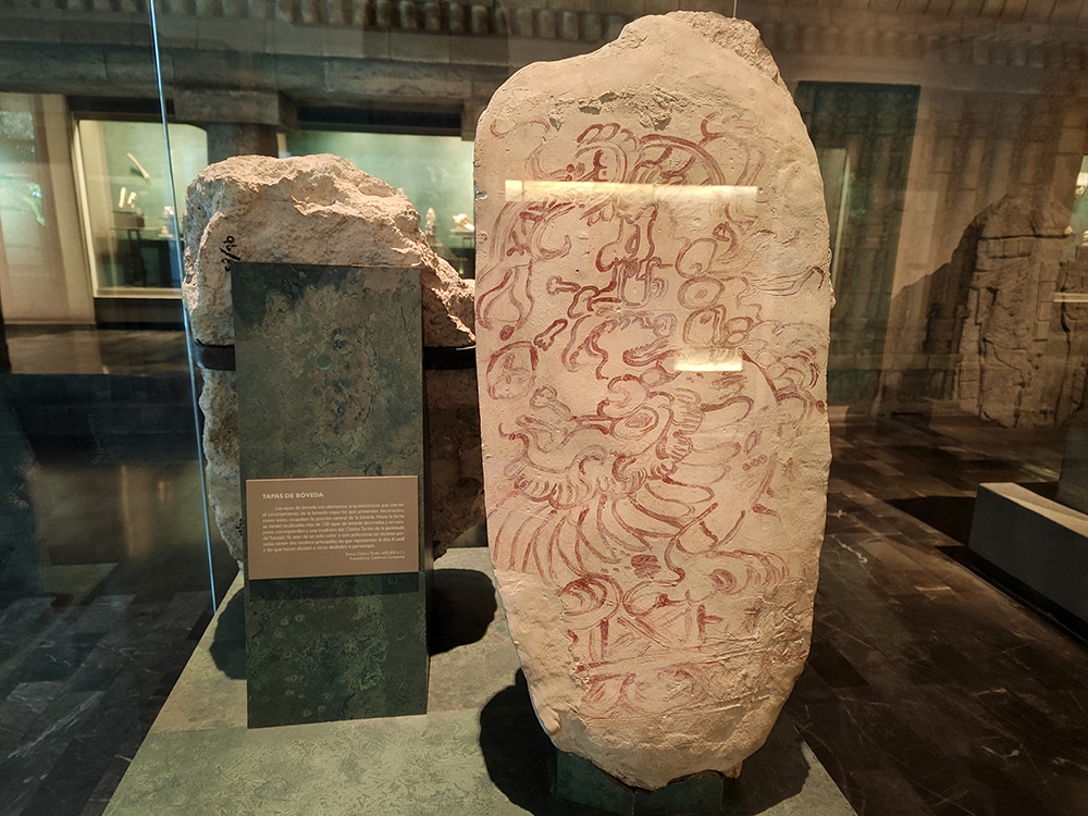 Мексиканская каменная плита-рельеф «Тапия де Соледад» (Tapia de Soledad) из культуры уастеков (хуастеков), IX–XI вв. н.э. На ней красной охрой нанесено изображение божества или правителя в сложном головном уборе из перьев кецаля, с масками и змеями.