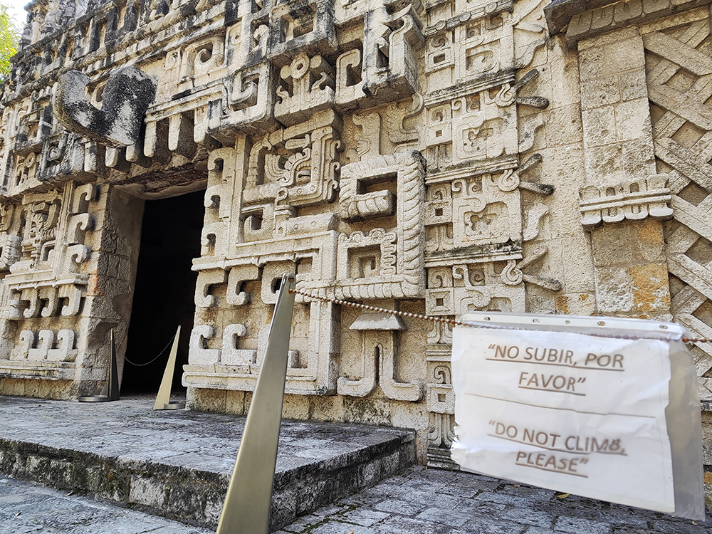 Фасад храма богини Луны (Structure 23) из археологического комплекса Эль-Тахин, выполненный в стиле «талуд-таблеро» с характерными нишами и рельефами в виде переплетающихся греческих меандров и геометрических узоров. Перед ним — копия стелы с иероглифическими надписями.