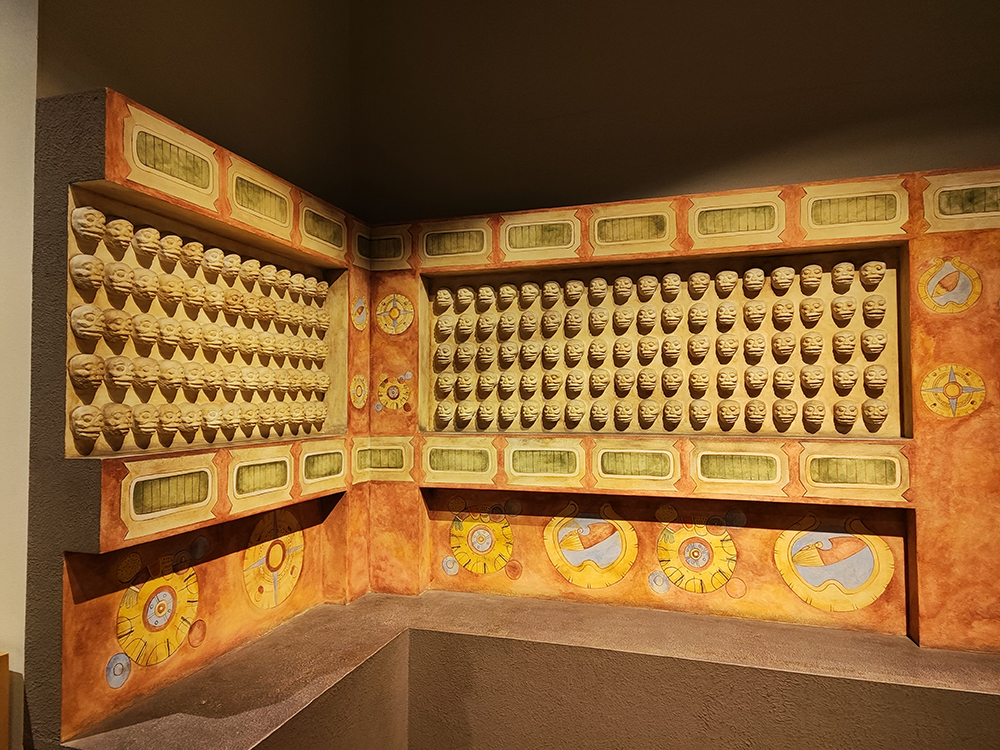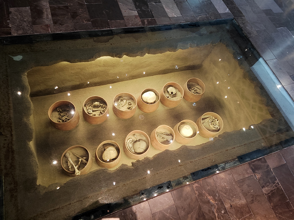 Археологическая реконструкция древнего захоронения в мексиканском стиле: в прямоугольной могиле под стеклом лежат 13 керамических сосудов, в большинстве из которых находятся черепа и кости. Тела уложены в позе эмбриона, головы ориентированы на запад. Это типичный погребальный обряд доиспанского периода Центральной Мексики (культура теотиуакан или ацтеки).