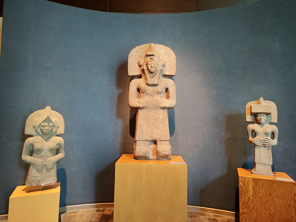 Три каменные статуи тольтекского стиля — атланты (колонны-воины) в уменьшенной копии. Центральная фигура — самая высокая и детализированная, изображает воина с нагрудным диском-пекторалью, в шлеме с перьями и с руками, скрещенными на животе. Две боковые статуи поменьше, повторяют ту же позу и атрибуты. Все три выполнены из светлого камня, с характерными угловатыми формами и плоскими головными уборами.