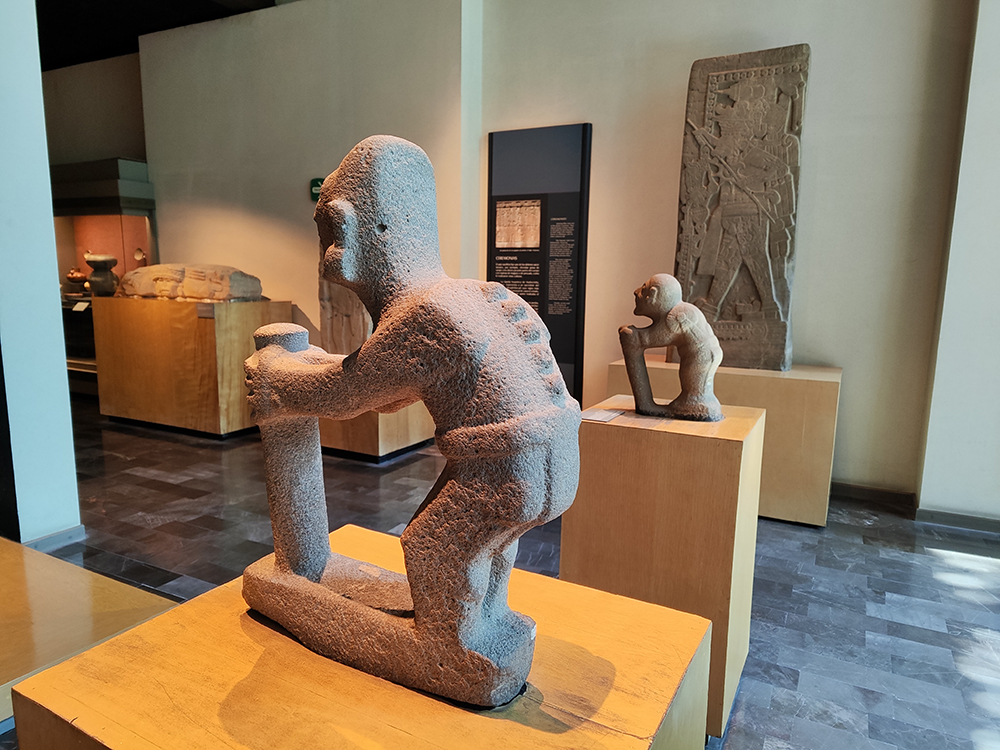 Каменная скульптура мексиканского божества Чак-Мооля — фигуры в позе полулежащего человека с чашей на животе для подношений. Над ним возвышается массивная голова Тлалока, бога дождя и плодородия, с характерными кольцевидными глазами, клыками и сложным головным убором из перьев и змей. Сбоку — рельефы с масками и символами, типичными для центральномексиканского стиля (тольтекско-ацтекского). Экспонат выполнен в классической мезоамериканской манере из вулканического камня.