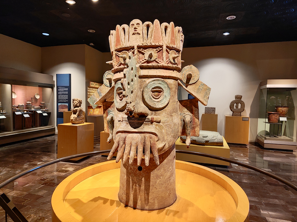 Миниатюрная копия храма Кетцалькоатля в Теотиуакане, выполненная в характерном мексиканском стиле талауд-таблеро с массивными колоннами и ступенчатым карнизом. Экспонат передаёт архитектуру древнего церемониального центра с плоской крышей и открытой передней частью, поддерживаемой толстыми цилиндрическими колоннами.