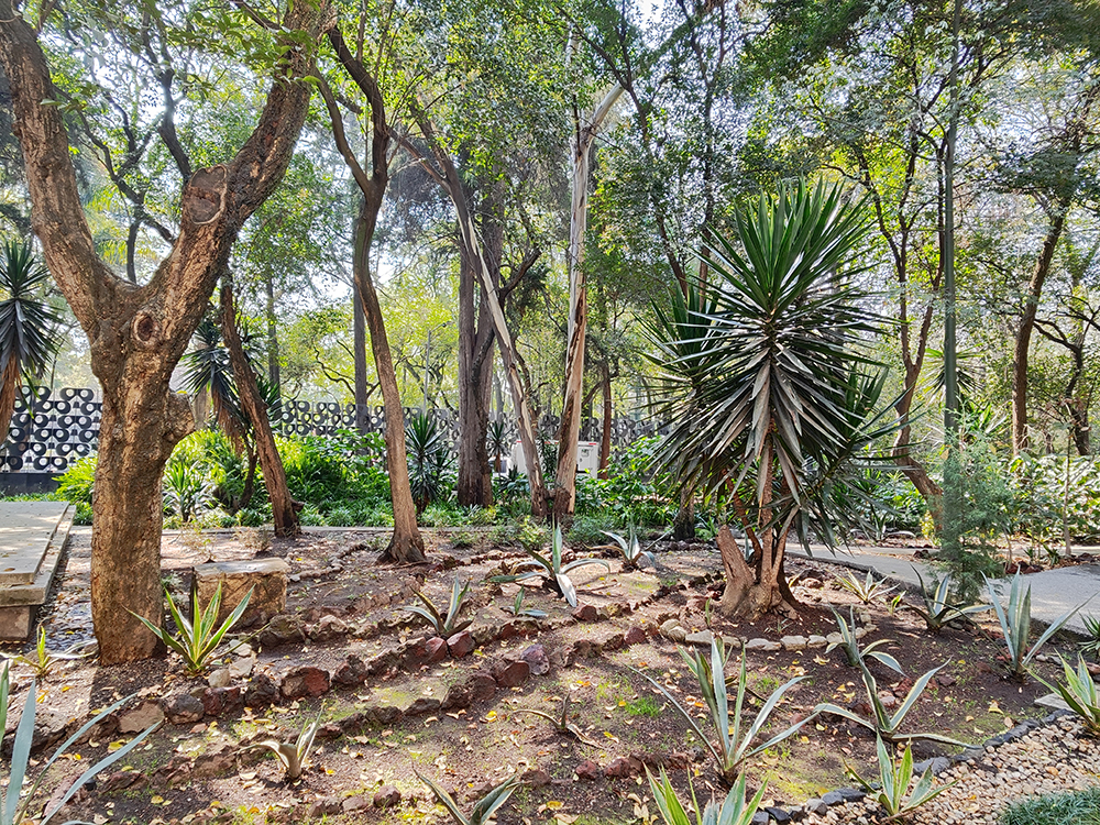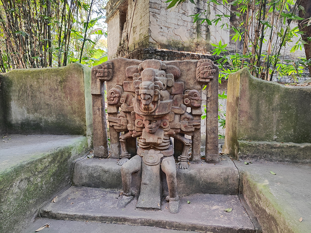 Группа древних каменных моделей мексиканских храмов-пирамид в натуральную величину, установленных под открытым небом среди деревьев. Самая крупная модель в центре, с широкой лестницей и прямоугольным проёмом, напоминает классические теокалли (храмы) доколумбовой эпохи.