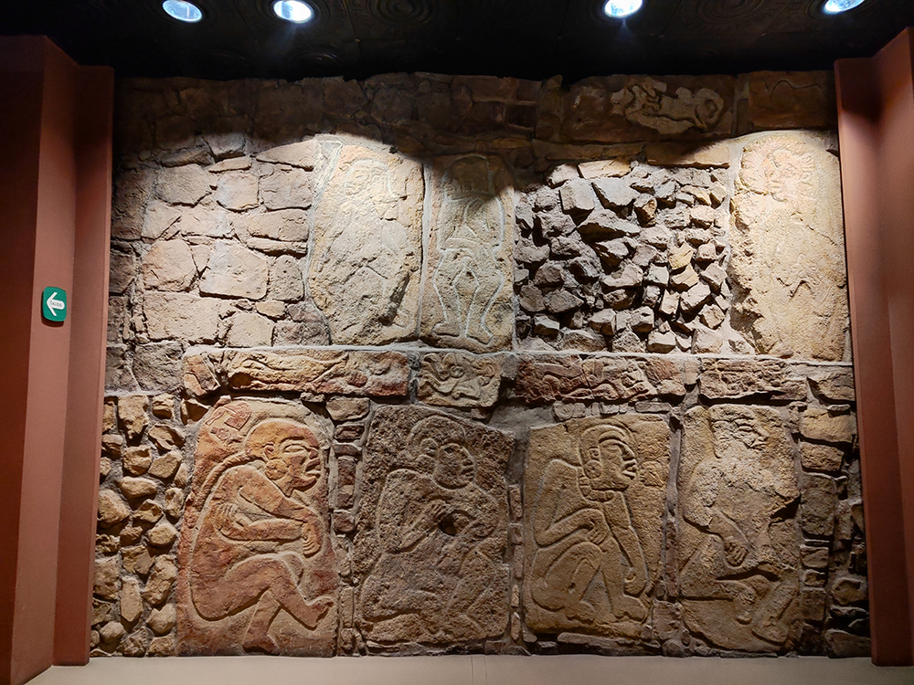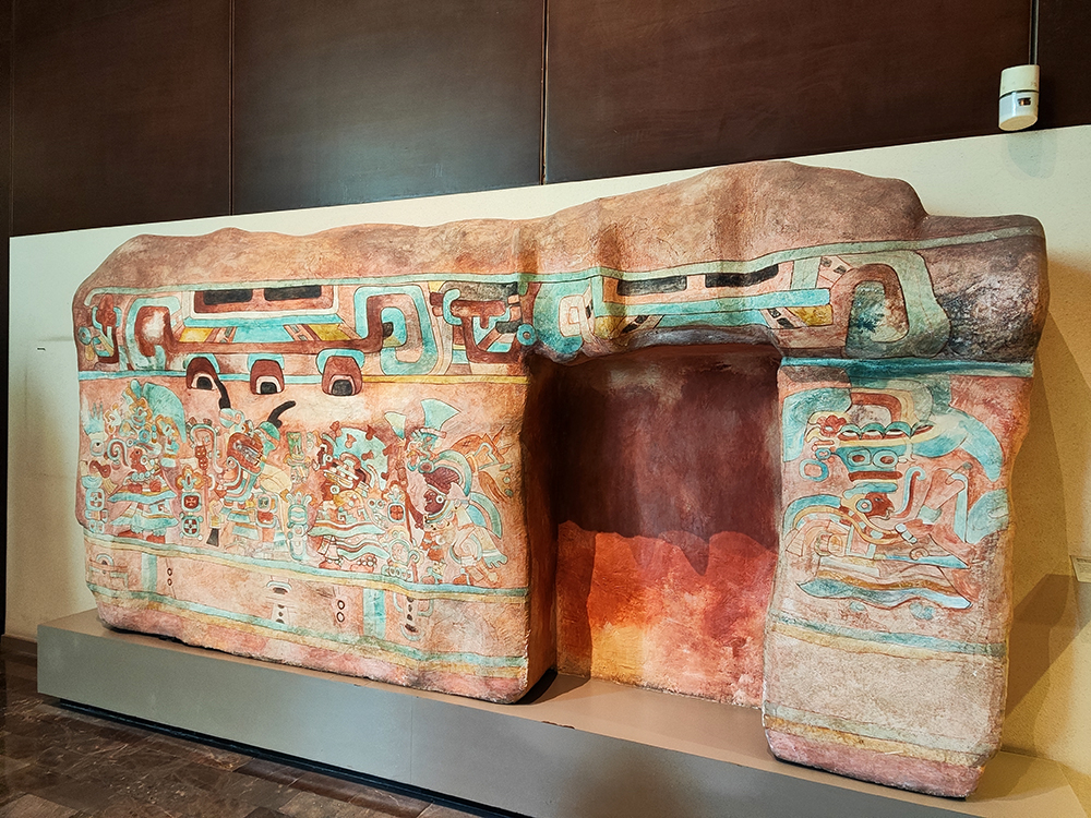 Большая каменная реконструкция фасада теокалли (храма-пирамиды) в мексиканском стиле, покрытая яркой полихромной росписью в красно-бирюзовых тонах. На нижнем ярусе изображена процессия из множества фигур божеств, воинов и жрецов в сложных головных уборах и с ритуальными предметами. Верхний ярус украшен геометрическим фризом с символами и стилизованными змеями. Центральная часть фасада представляет собой дверной проём, ведущий внутрь храма. Экспонат выполнен в натуральную величину и сохраняет оригинальные цвета древней росписи.