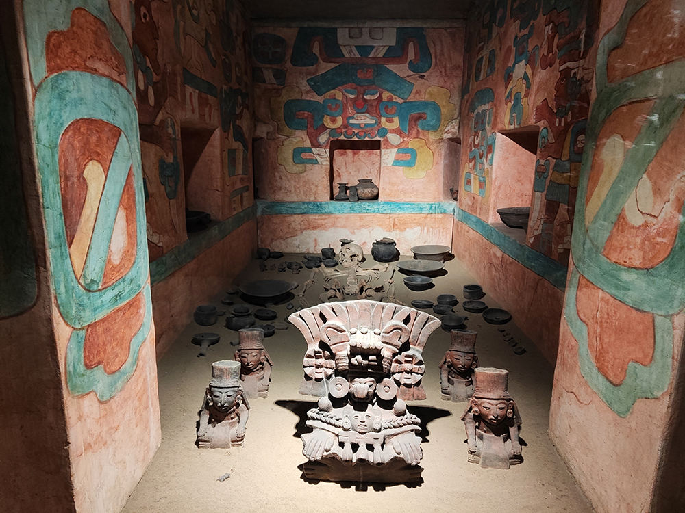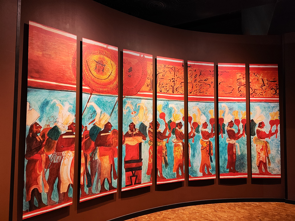 Стены расписаны фресками в классическом майяском стиле, на полу — керамические сосуды и вотивные предметы, точно воспроизводящие погребальный инвентарь оригинальной гробницы.