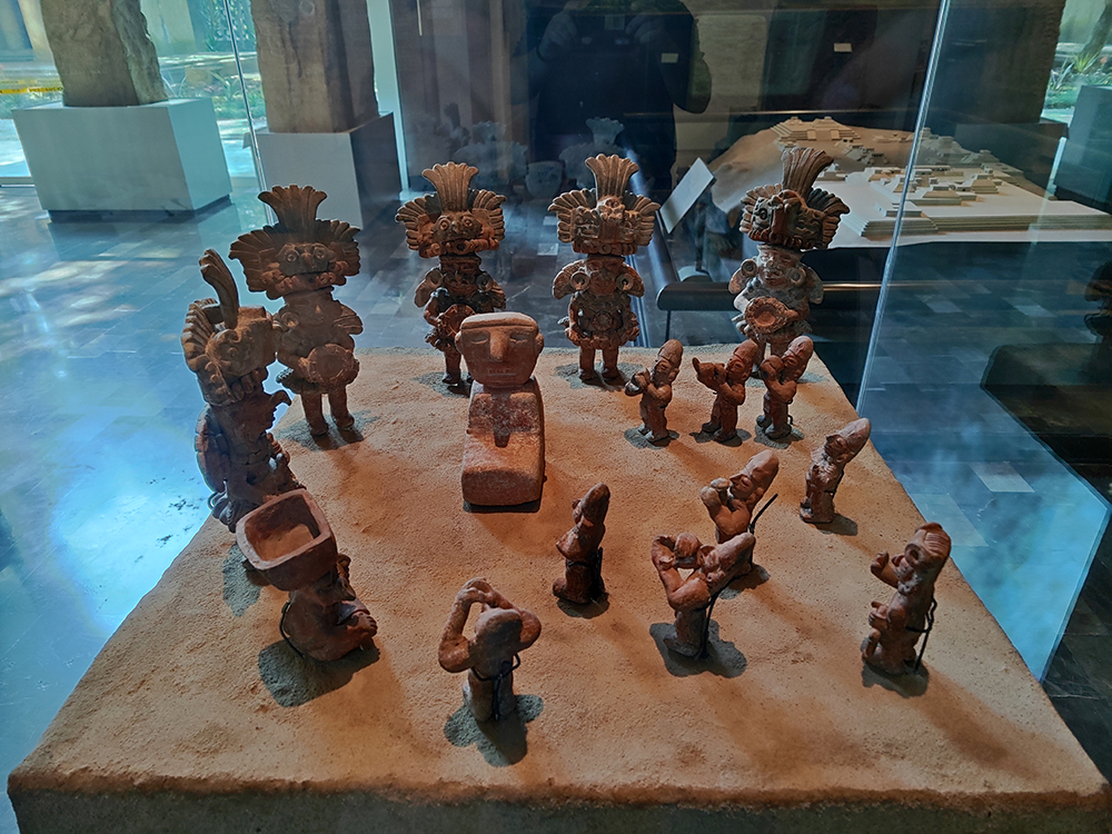 Группа древних керамических ацтекских фигурок из обожжённой глины. В центре — крупная прямоугольная фигура с простым лицом, возможно изображение божества или алтаря. Вокруг неё — несколько высоких антропоморфных фигур в сложных пернатых головных уборах, типичных для мексиканской иконографии. Ещё ниже — миниатюрные фигурки людей в разных позах: играющие на музыкальных инструментах, несущие сосуды, танцующие или совершающие ритуальные жесты. Всё выполнено в характерном красно-коричневом цвете терракоты.