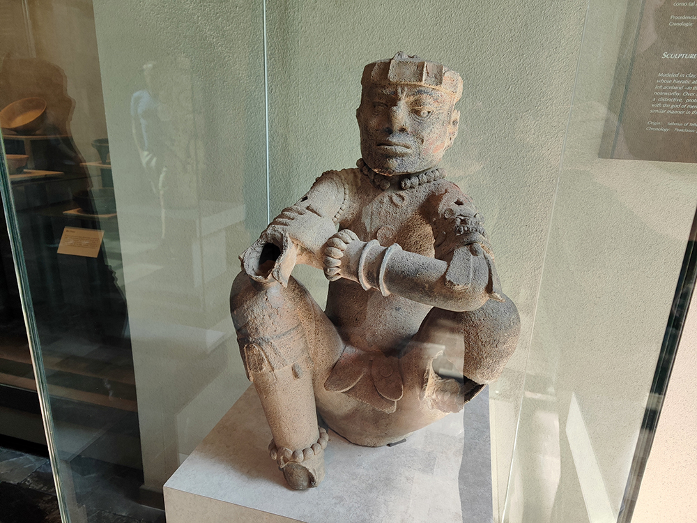 Мексиканская керамическая фигура периода классической эпохи (примерно III–IX вв. н.э.), из культуры Теотиуакана или близкой традиции. Скульптура изображает сидящего мужчину в позе лотоса или скрестив ноги, с руками, сложенными на коленях. Он носит сложный головной убор, ожерелье и браслеты, а также набедренную повязку с декоративными элементами. Фигура выполнена в характерном для того времени стиле: слегка вытянутые пропорции, спокойное выражение лица, богатый орнамент одежды и украшений. Руки и некоторые детали повреждены, что типично для древних керамических изделий.