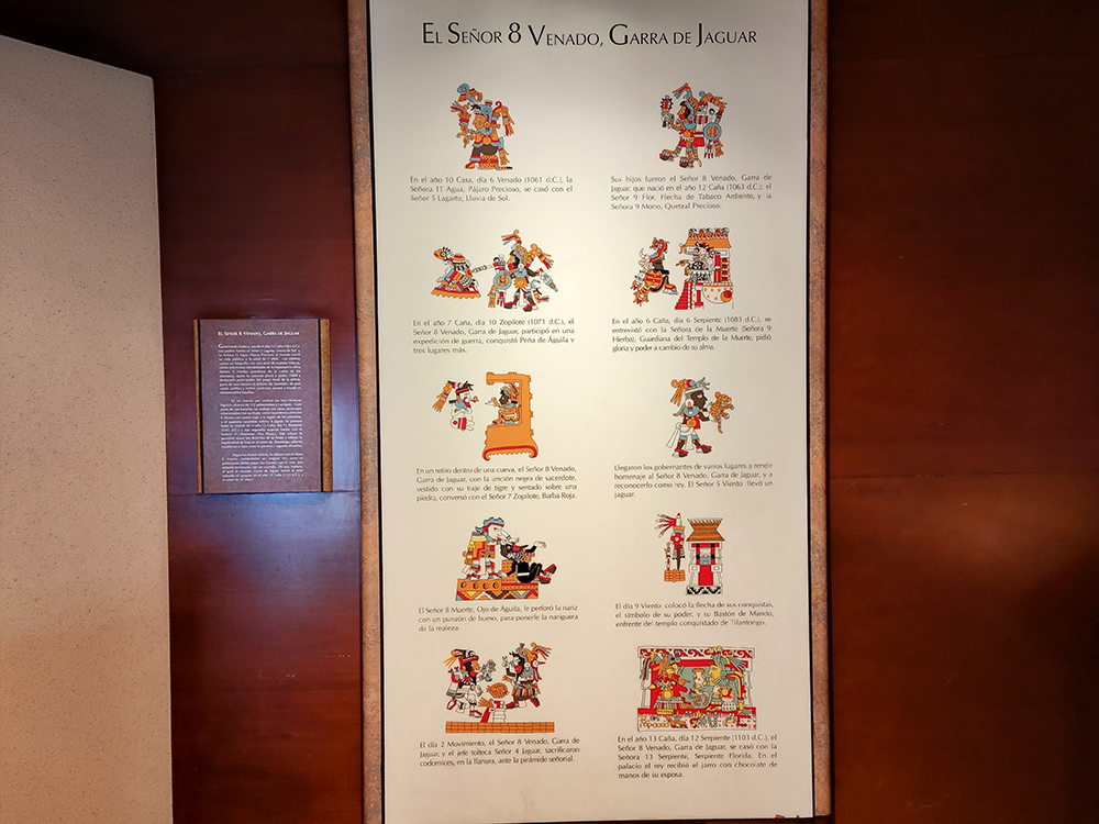 Информационный стенд с цветными прорисовками сцен из мексиканских кодексов, посвящённый майяскому правителю по имени 8 Олень Коготь Ягуара (восемь Олень Нагуаль Ягуара). На стенде показана хронология ключевых событий его жизни: рождение, военные походы, завоевания, заключение союзов, ритуалы и, в конце, его смерть и посмертное обожествление. Все сцены сопровождаются датами по майяскому календарю и краткими пояснениями на испанском языке. Иллюстрации выполнены в характерном стиле постклассических микстекских кодексов: плоские яркие фигуры на белом фоне, с иероглифами и красной линией, обозначающей жизненный путь правителя.