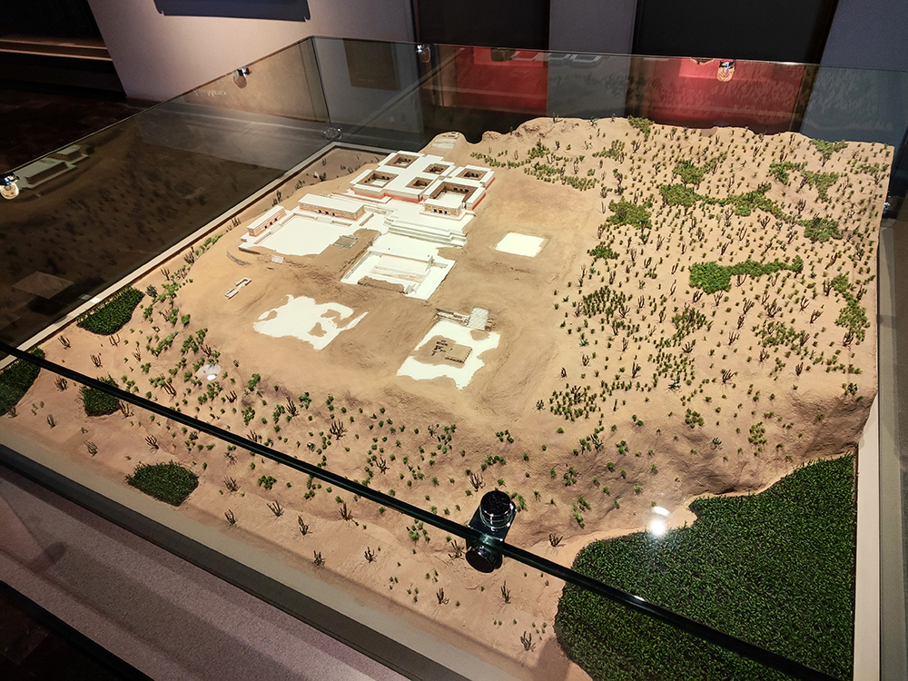 Детальная масштабная модель древнего города с центральным архитектурным комплексом, состоящим из нескольких платформ, пирамид и прямоугольных сооружений, характерных для мексиканской доколумбовой архитектуры. Вокруг комплекса — обширная территория с имитацией пустынного ландшафта, редкими кустами, кактусами и небольшими зелёными участками, обозначающими оазисы или возделываемые поля. Модель передаёт планировку крупного церемониального и жилого центра в окружении природной среды.