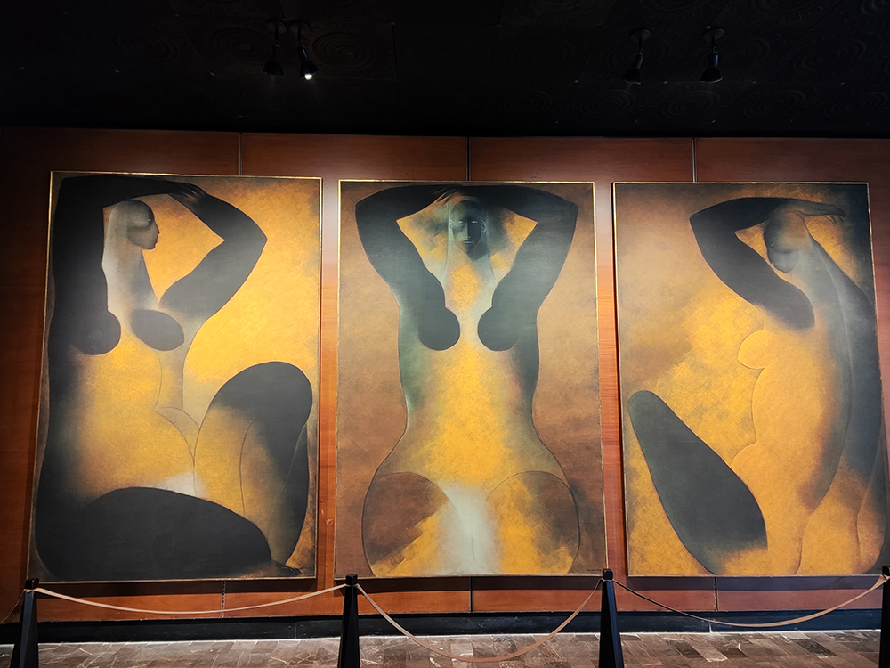 Триптих с тремя крупными полотнами, на которых изображены стилизованные женские фигуры в позах с поднятыми и согнутыми в локтях руками. Фигуры выполнены в характерной мексиканской манере: мягкие, обобщённые формы, тёплый золотисто-охристый фон с дымчато-зелёными и чёрными силуэтами. Автор — Руфино Тамайо.