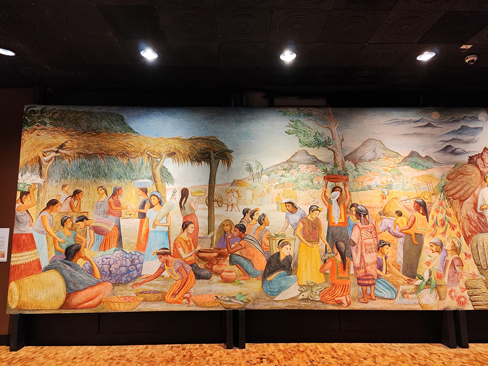 Гигантская настенная роспись в мексиканском стиле, изображающая повседневную жизнь людей разных эпох и социальных слоёв. Слева доминирует огромное мифологическое существо — древнее божество или дух земли — с суровым лицом, держащее в объятиях группу людей. Справа — оживлённая рыночная площадь с колониальной церковью на заднем плане, торговцами, ремесленниками, женщинами в традиционных одеждах, детьми и животными. Всё выполнено в тёплых тонах с богатой детализацией, сочетающей доиспанские мотивы и реалии колониального и современного периода.