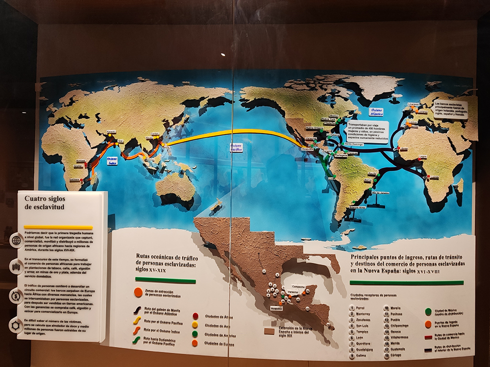 Мексиканский музейный экспонат, представляющий собой большую панорамную карту на стене, иллюстрирующую океанские маршруты трансатлантического и тихоокеанского трафика порабощенных африканцев в период с XVI по XIX век. Карта охватывает мир от Африки через Атлантику к Америке, с дополнительными линиями через Тихий океан к Азии и обратно, показывая ключевые зоны захвата людей в Африке (зелеными зонами), порты отправления и прибытия (оранжевыми точками), города в Новой Испании как места приема и распределения (красными, желтыми и оранжевыми маркерами вроде Веракруса, Акапулько, Мехико, Пуэблы). Маршруты обозначены цветными линиями: желтой для Атлантического, оранжевой для Манильского галеона, черной для эндемической, зеленой для тихоокеанской. На переднем плане панель с заголовком о четырех веках рабства, текстом о глобальном характере торговли, символами для маршрутов и списками городов, портов, зон извлечения. Экспонат подчеркивает объемы перевозок миллионов людей на плантации табака, кофе, сахара и в шахты, с акцентом на европейские и азиатские связи.