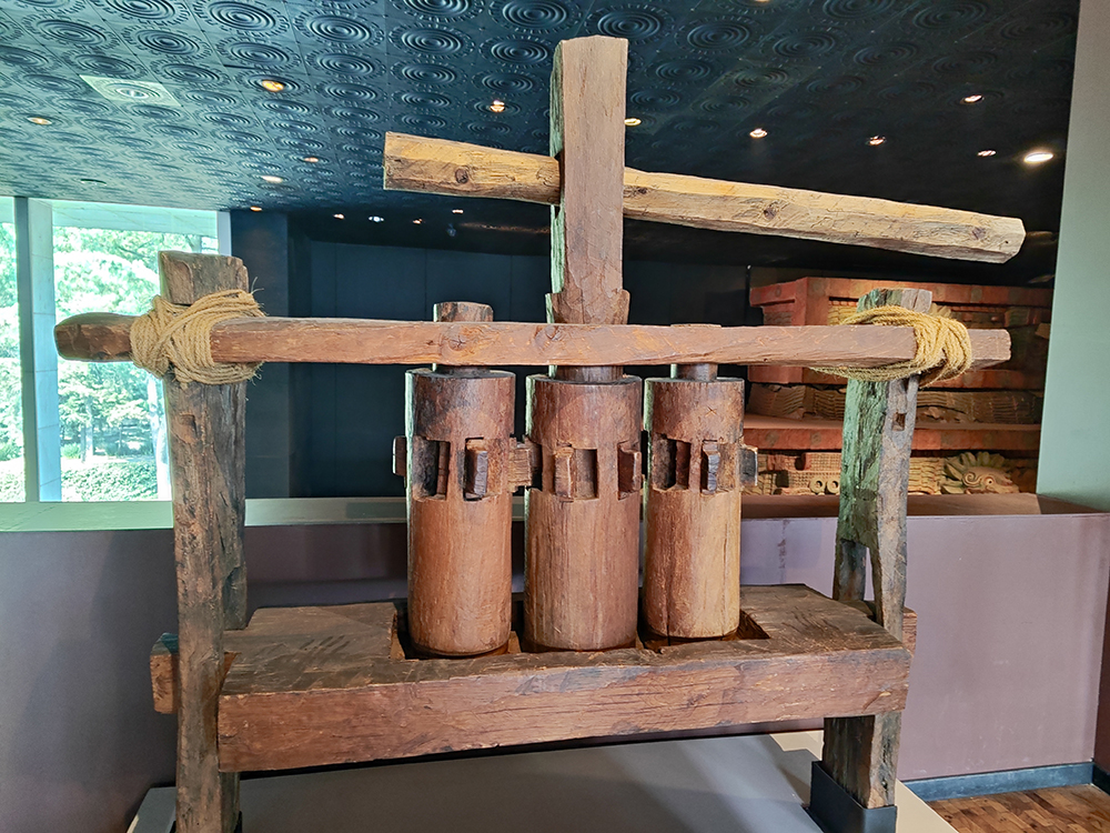 Деревянный пресс с тремя вертикальными цилиндрами, оснащёнными зубцами для передачи движения, горизонтальной балкой и длинным рычагом для создания давления — традиционный мексиканский инструмент для отжима сока из агавы или подобных растений в процессе производства пульке.
