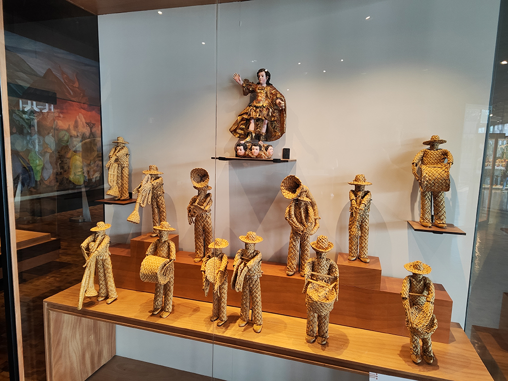 Коллекция мексиканских традиционных фигурок, сплетённых из кукурузных листьев (totomoxtle) или пальмовых волокон в виде крестьян и музыкантов в сомбреро, с музыкальными инструментами, корзинами и сумками. В центре на возвышении — фигура Santo Niño de Atocha, одетого как странник-пилигрим в плаще, с поднятыми руками в благословляющем жесте. Это примеры народного искусства, изображающие повседневную жизнь и религиозные мотивы.