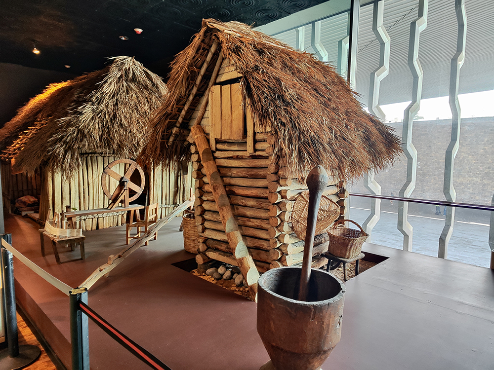Реконструкция традиционной мексиканской сельской хижины с крутой соломенной крышей из пальмовых листьев, стенами из горизонтально уложенных брёвен, приподнятой на камнях основой и деревянной дверью. На переднем плане большой деревянный мортеро с пестом для измельчения зерна, рядом плетёные корзины, метла и другие бытовые предметы. Вокруг видны элементы другой похожей постройки с ткацким станком и деревянным колесом, что иллюстрирует повседневный быт коренных народов.