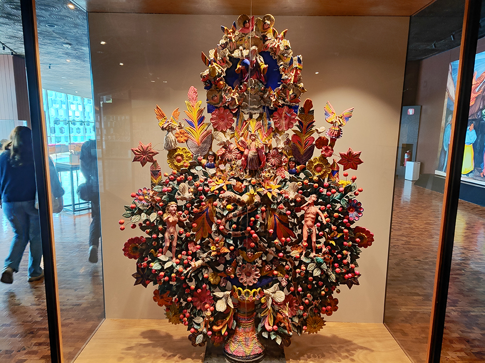 Яркая мексиканская керамическая скульптура «Древо жизни» — многоярусная композиция в форме дерева, обильно украшенная разноцветными цветами, листьями, плодами, фигурками ангелов, херувимов и библейских персонажей. Вершина увенчана сценой с центральными фигурами в окружении крылатых существ, а ствол и ветви густо покрыты орнаментами и мелкими деталями в насыщенных тонах красного, жёлтого, синего и зелёного.