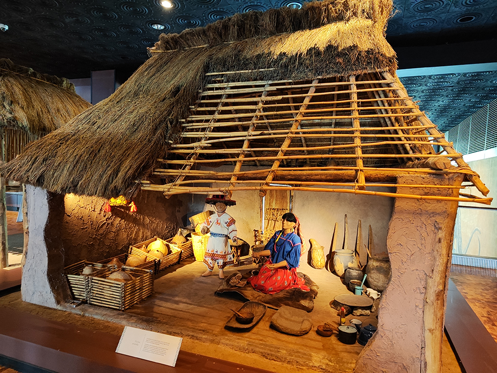 Реконструкция традиционного мексиканского сельского жилища с крутой соломенной крышей из пальмовых листьев, стенами из деревянных жердей и открытым интерьером. Внутри манекены изображают повседневную жизнь: женщина в ярком мексиканском народном платье с вышитой блузкой, широкой юбкой, шляпой и гирляндами из цветов стоит за столом с утварью, а рядом фигура в белой одежде, возможно, ребёнок или другой член семьи. На полу и полках расставлены глиняные горшки, корзины, метаты для измельчения кукурузы, комаль и другие предметы быта, иллюстрирующие традиционный домашний уклад коренных народов.