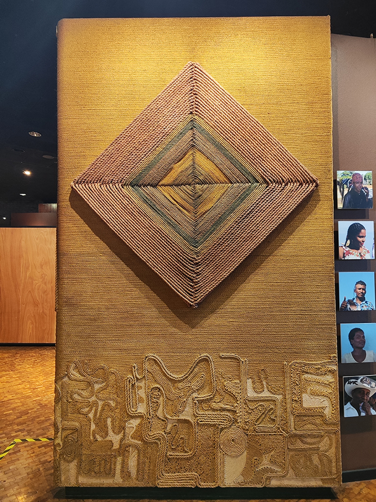 Крупный настенный гобелен в стиле мексиканского современного искусства, созданный из толстых свитых веревок в золотисто-коричневых тонах. В центре — большой ромбовидный узор из концентрических слоев веревки с переходом от бежевого к зеленоватому и желтому в середине, создающий эффект глубины и оптической иллюзии. Нижняя часть украшена абстрактными рельефными мотивами из переплетенных веревок, напоминающими лабиринт или стилизованные традиционные орнаменты. Справа от гобелена видны несколько портретных фотографий людей в традиционной одежде.