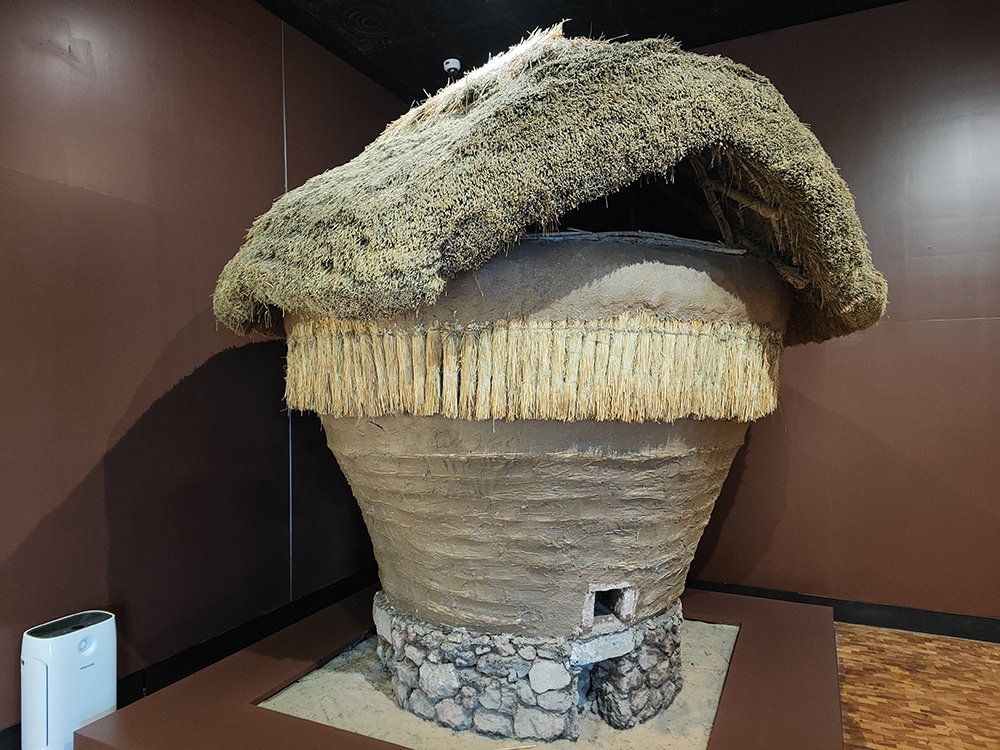 Реконструкция традиционного мексиканского куэскомате — амбара для хранения кукурузы в доколумбовый период. Это большой глиняный сосуд бутылкообразной формы с горизонтальными бороздками на поверхности, установленным на каменном основании с небольшим отверстием внизу для доступа. Сверху он покрыт конической крышей из плотной сухой соломы с бахромой по краю, имитирующей соломенный навес. Экспонат демонстрирует древние способы хранения зерна у мезоамериканских народов.