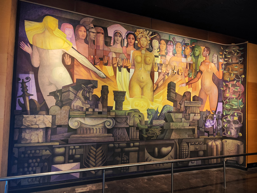 Крупная настенная роспись в кубистическом стиле, изображающая множество обнажённых женских фигур с разнообразными лицами и головными уборами, вдохновлёнными мексиканскими традициями. В центре — сияющая жёлтым светом фигура с распростёртыми руками, окружённая геометрическими элементами древней архитектуры: колоннами, пирамидами, ступенчатыми постройками и скульптурами животных. Композиция сочетает тёплые и холодные тона, подчёркивая темы единства культур и разнообразия человечества на фоне доиспанского наследия.