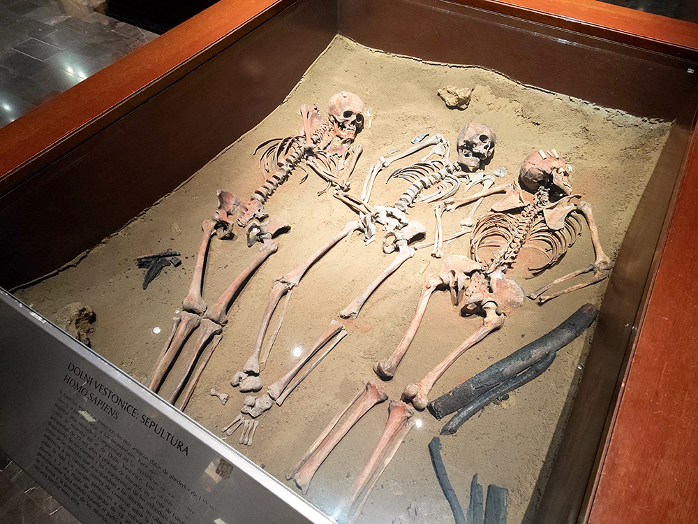 Тройное погребение трёх молодых людей эпохи верхнего палеолита из Дольни-Вестонице — реплика знаменитого археологического находки возрастом около 27 тысяч лет. Скелеты лежат рядом в песчаной почве: слева — на спине с рукой, протянутой к центру, центральный — с признаками патологий, справа — также на спине с повернутой головой. Вокруг видны следы красной охры, фрагменты артефактов и зубы животных, подчёркивающие ритуальный характер захоронения ранних Homo sapiens.