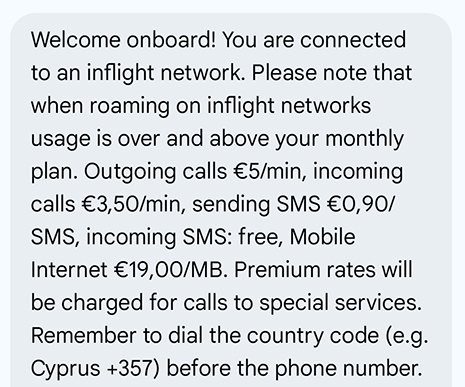 На борту был интернет! Это бортовая сотовая сеть самолёта Emirates, работающая через спутник. Но тарифы — космос, да (19 евро за мегабайт). Симка кипрская, поэтому тут речь про Кипр.