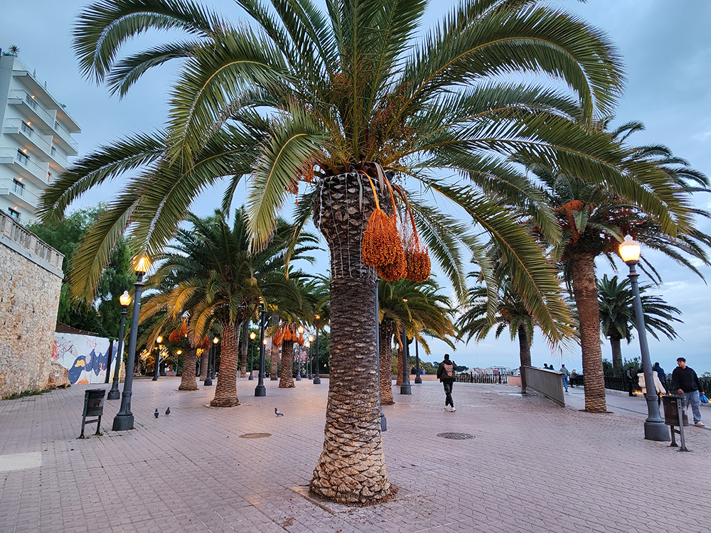 Круглая клумба с красными цветами на переднем плане изображает эмблему кастельеров (castells — традиционные человеческие башни, символ Таррагоны как “города человеческих башен”). Это популярный мотив в местных парках и декорациях, подчёркивающий культурную традицию региона.