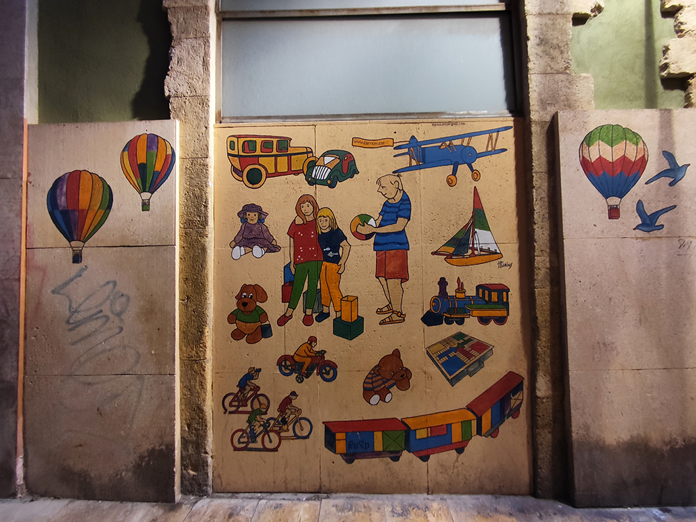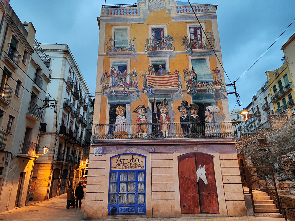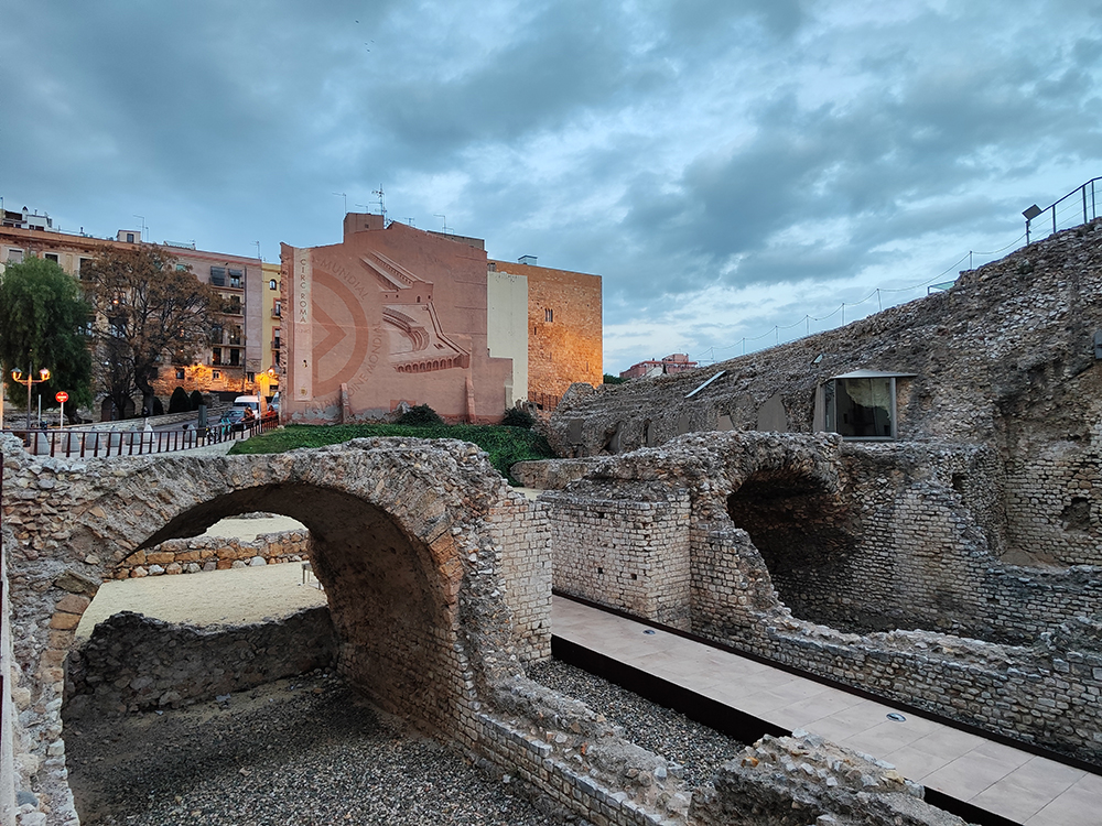 На заднем плане виден фасад здания с большой фреской (муралом), изображающей сам амфитеатр — это современное художественное оформление, подчёркивающее историческое значение места и интегрированное в городской ландшафт Таррагоны.
