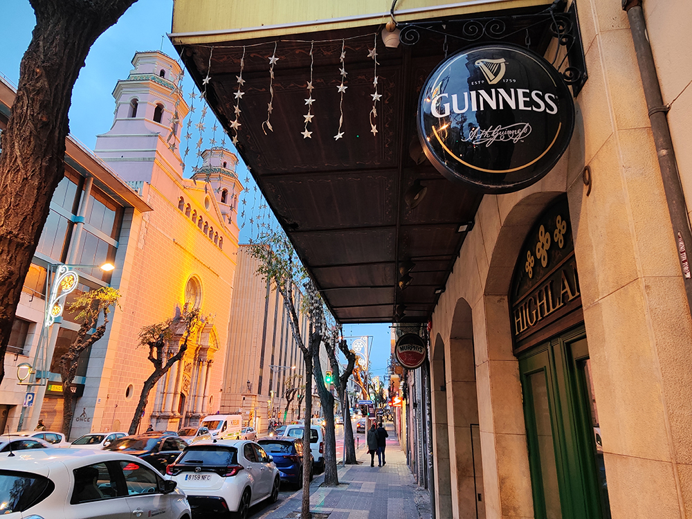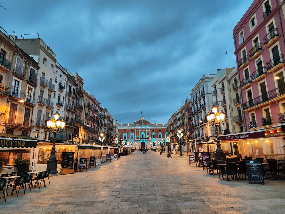 Это одна из главных и самых оживлённых площадей города: прямоугольная пешеходная зона, окружённая разноцветными зданиями с балконами, уличными кафе и ресторанами с террасами. В глубине виднеется здание мэрии (Ajuntament de Tarragona) — неоклассическое сооружение с колоннами и подсветкой. Справа на фото заметна вывеска Hotel Plaça de la Font, который расположен прямо на площади.