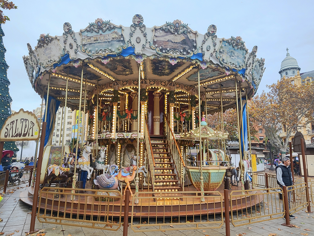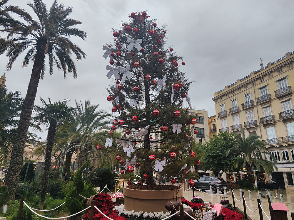 Фотография снята со стороны Площади Девы Марии (Plaza de la Virgen), где на Рождество традиционно устанавливают большой вертеп (belen — рождественский вертеп с фигурами) и фонтан Турии. Люди на переднем плане смотрят именно на него.