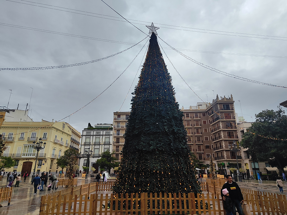 Справа: Palau de la Generalitat Valenciana (Дворец Генералитата Валенсии) — готическое здание XV века с характерной изогнутой арочной галереей (колоннадой). Сейчас это резиденция регионального правительства Валенсии.
