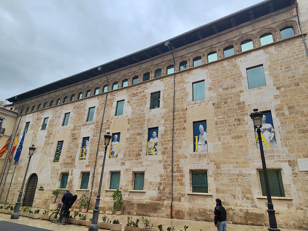 Большие баннеры с буквами B O R J A и классическими бюстами рекламируют временную выставку, посвящённую семье Борха (Borja/Borgia) — знаменитой валенсийской династии (включая пап римских Каликста III и Александра VI). Такие экспозиции часто проходят в музеях Валенсии, подчёркивая связь города с этой семьёй в эпоху Золотого века.
