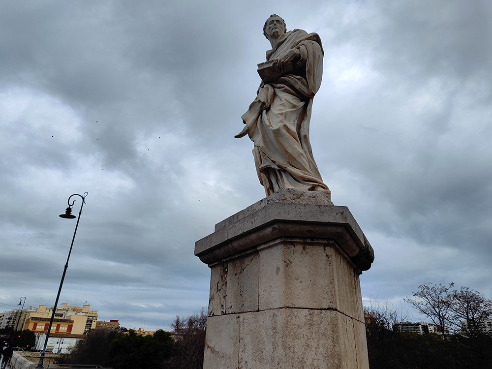 Статуя в барочном стиле работы итальянского скульптора Джакомо Понзанелли (Giacomo Ponzanelli) стоит на высоком пьедестале. Она изображает святого в епископских одеждах с митрой на голове и жестом благословения. Это одна из двух похожих статуй (вторая — святого Луиса Бертрана), которые сейчас находятся на мосту Тринидад (Puente de la Trinidad) — одном из исторических мостов Валенсии через бывшее русло реки Турия (сейчас это сады Турия).