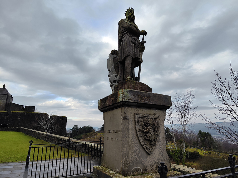 Надпись на постаменте: “ROBERT THE BRUCE JUNE 64 1314″ — отсылка к Битве при Баннокберне 24 июня 1314 года, где Брюс одержал решающую победу над англичанами, обеспечив независимость Шотландии.